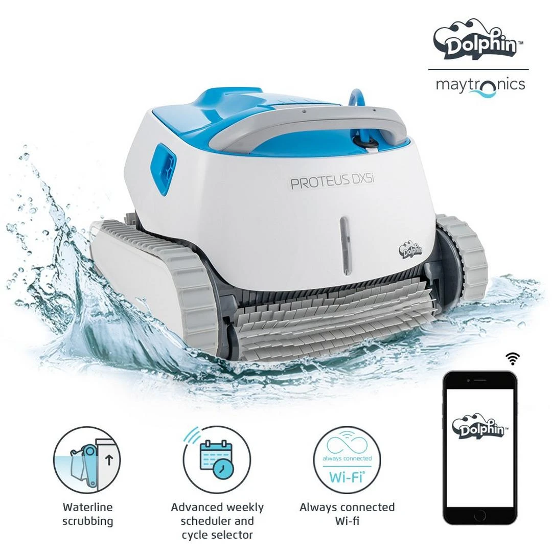 Dolphin Proteus DX5i Robotic Pool Cleaner with Wi-Fi is an effortlessly smart robot that delivers a reliable and deep cleaning experience, allowing you to make your pool perfect from anywhere, anytime.